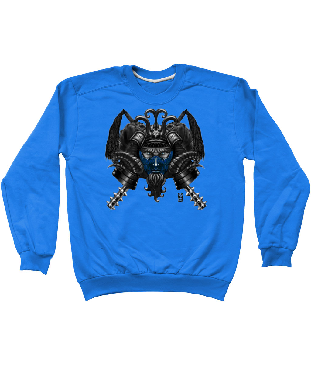 This Sweatshirt is part of our zodiac Samurai clothing collection, featuring Drop Shoulder Sweatshirt design of Aries zodiac with Blue mask in Japanese Samurai art style. The Aries sweatshirt is made to order and available in multiple colors for your convenience.