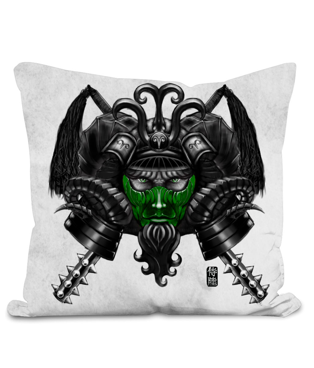 This throw cushion is part of our zodiac Samurai home décor collection. The design is printed on front and back of the pillow and available in 2 colors and 2 sizes. Featuring design of Aries zodiac with Green mask. This Samurai cushion is sure to make your space awesome.