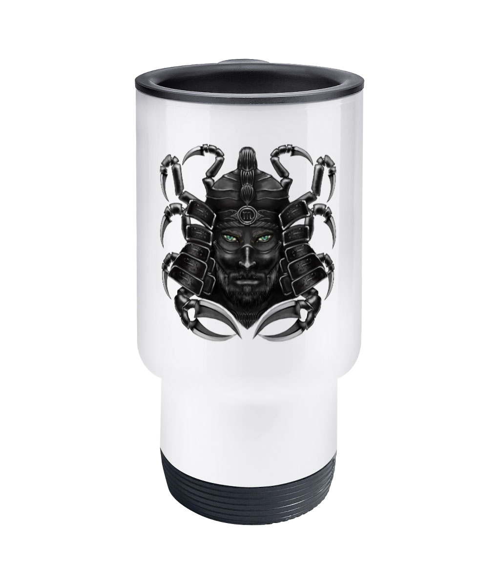 This is a 14oz stainless steel travel mug with Black Scorpio print, the travel mug has a matte white finish and is great forkeeping your coffee warm.