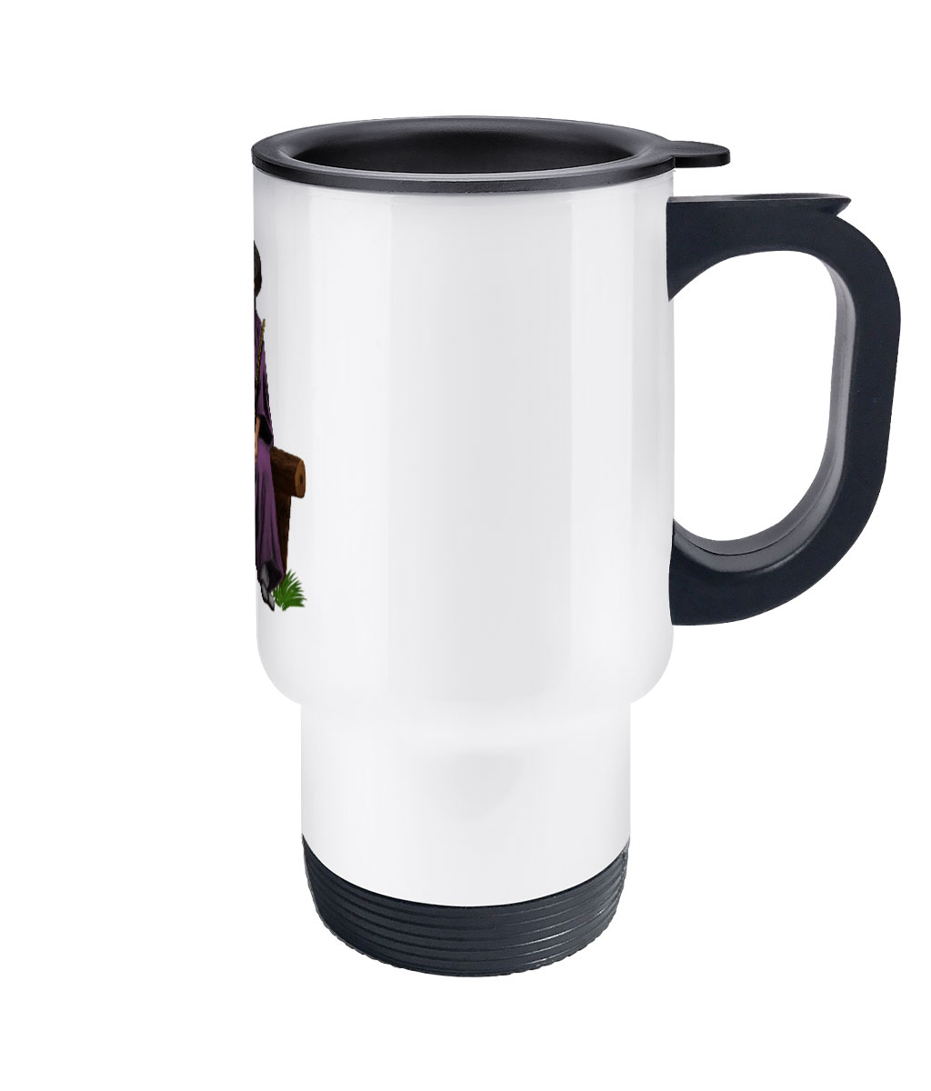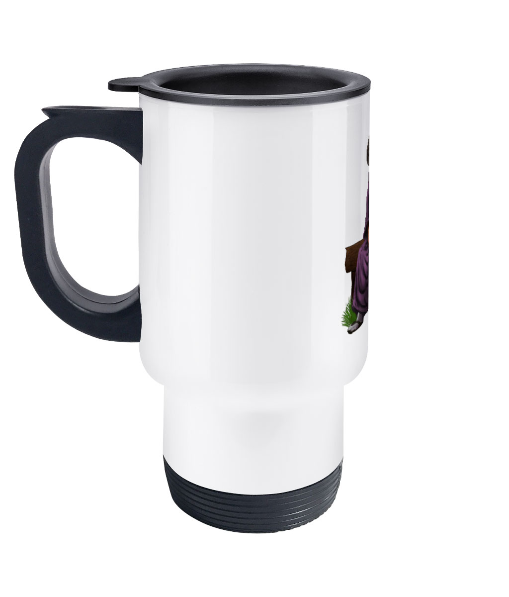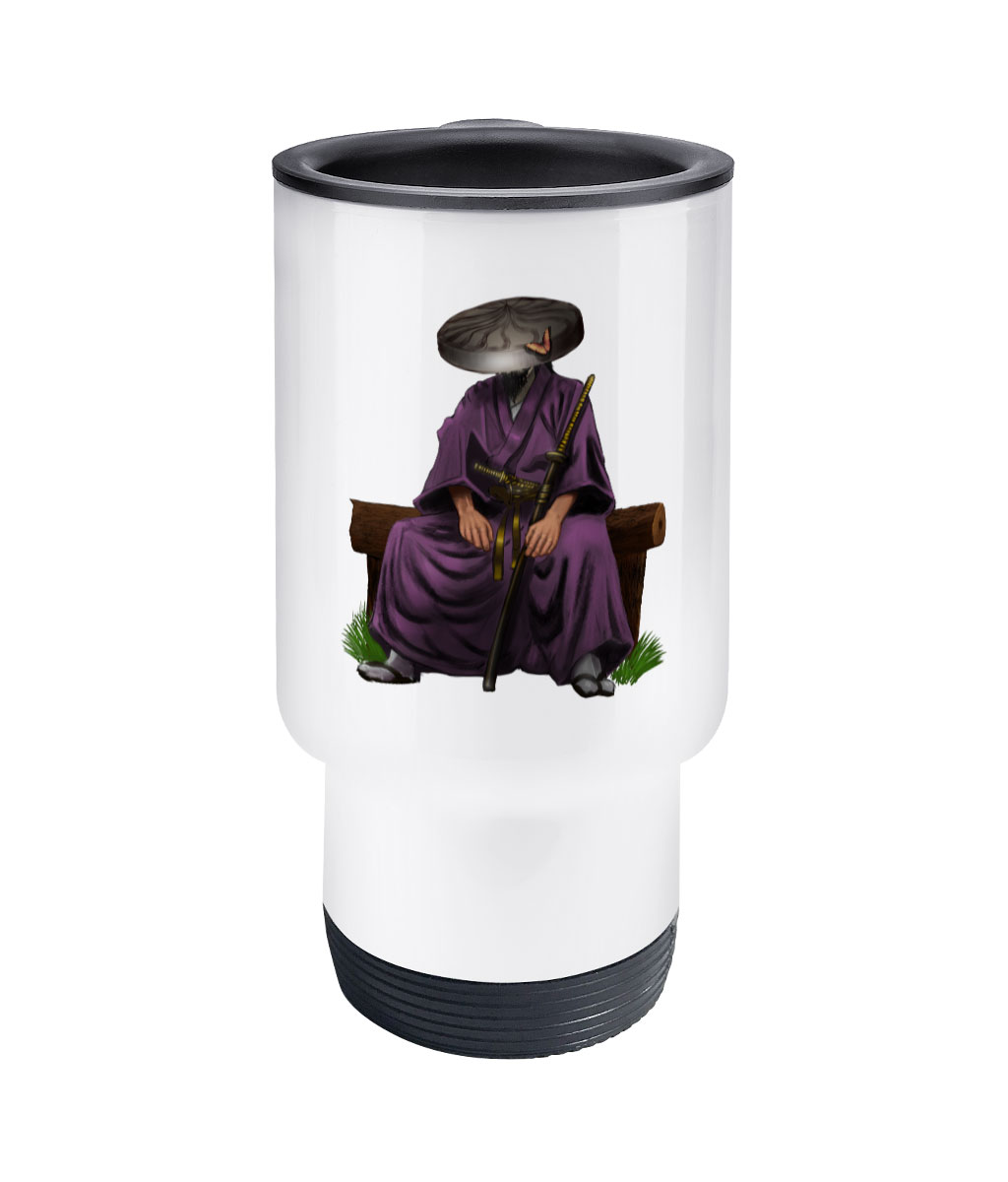 This 14oz stainless steel travel mug is made to order, featuering design of a Samurai sitting on a bench, the travel mug has a matte white finish and perfect for keeping your drink hot.