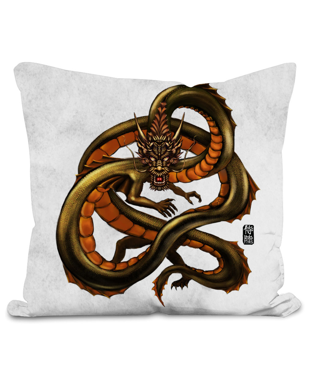 This throw cushion is part of our Samurai home décor collection. The design is printed on front and back of the pillow and available in 2 colors and 2 sizes. Featuring design of a dragon in earthy colors with Samurai.Land seal mark.