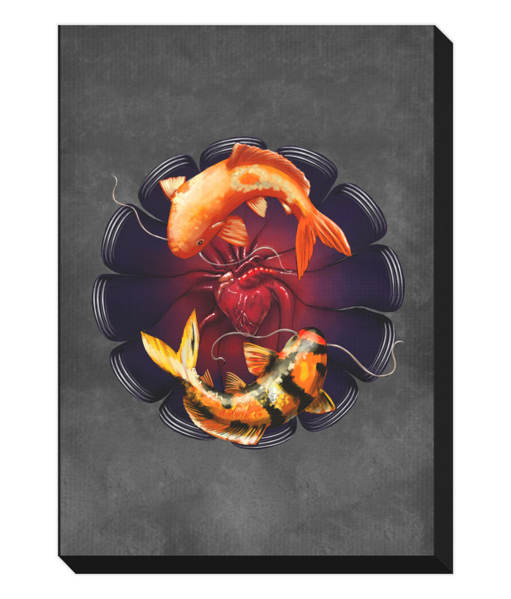 This Canvas art print is part of our Samurai home décor collection. The design is printed using UV ink cured under a UV lightbar with a thick 24mm frame. Featuring design of two koi fish swimming around human heart. This Samurai art print canvas is perfect for adding some Japanese style to your house.