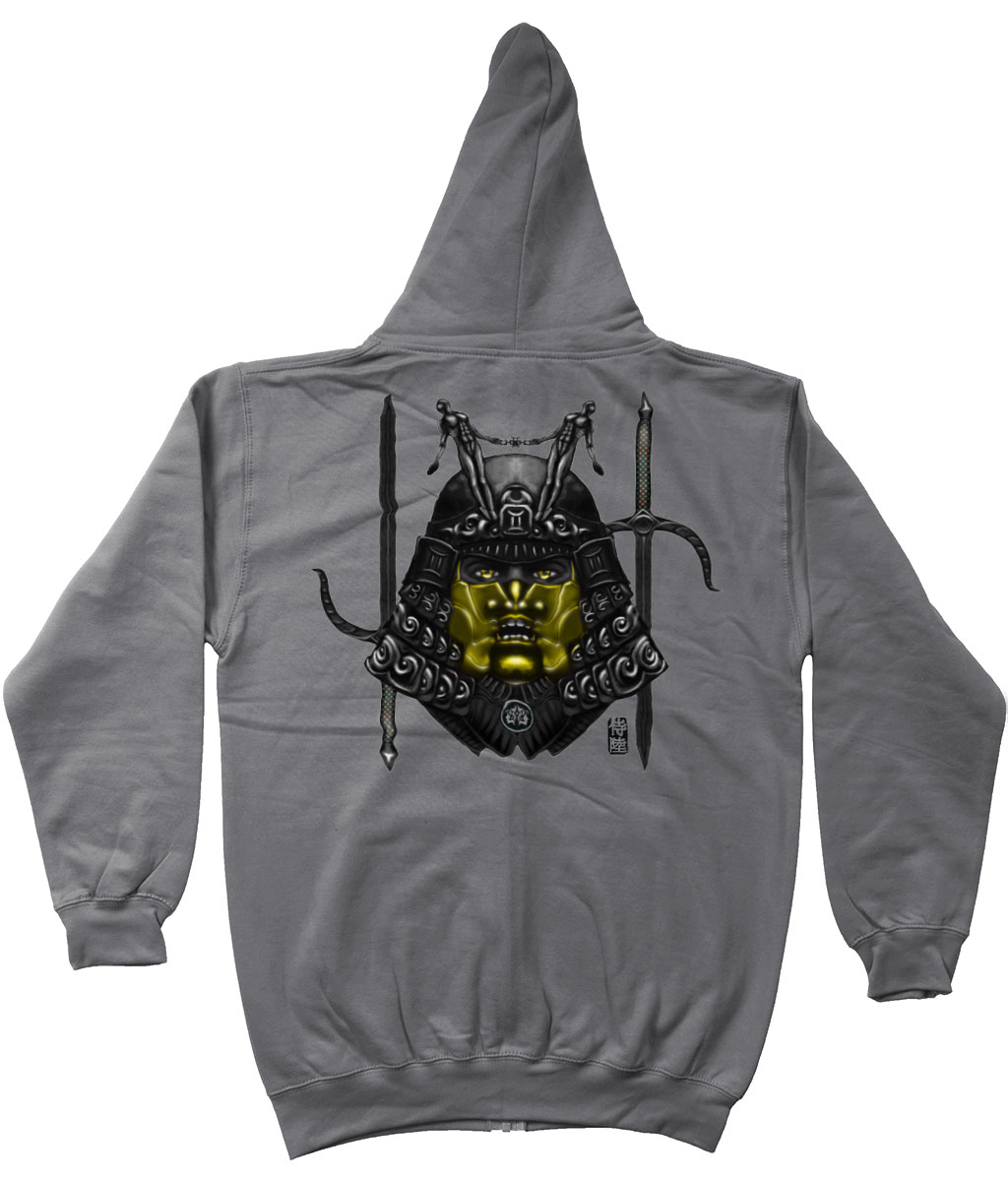 This hoodie with zipper is part of our zodiac Samurai clothing collection, featuring back printed design of Gemini zodiac with Gold mask in Japanese Samurai art style. This zipper hoodie is made to order and available in multiple colors for your convenience.