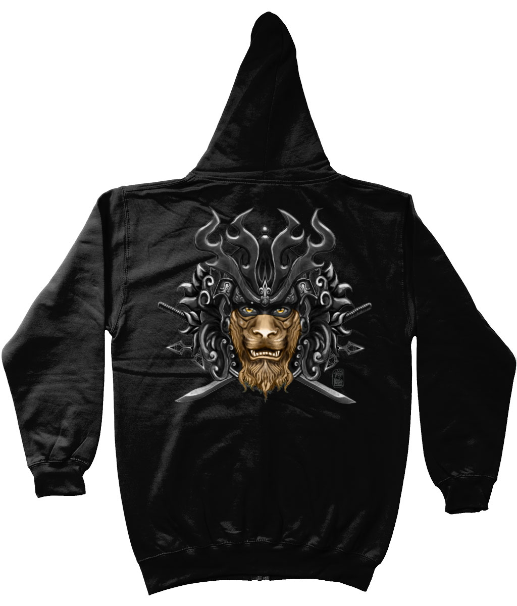 This hoodie with zipper is part of our zodiac Samurai clothing collection, featuring back printed design of Leo zodiac with Brown mask in Japanese Samurai art style. This zipper hoodie is made to order and available in multiple colors for your convenience.