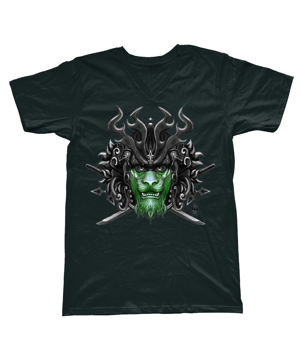 This V Neck T-Shirt is part of our zodiac Samurai clothing collection, featuring V Neck T-Shirt design of Leo zodiac with Green mask in Japanese Samurai art style. The Samurai shirt is made to order and available in multiple colors for your convenience.