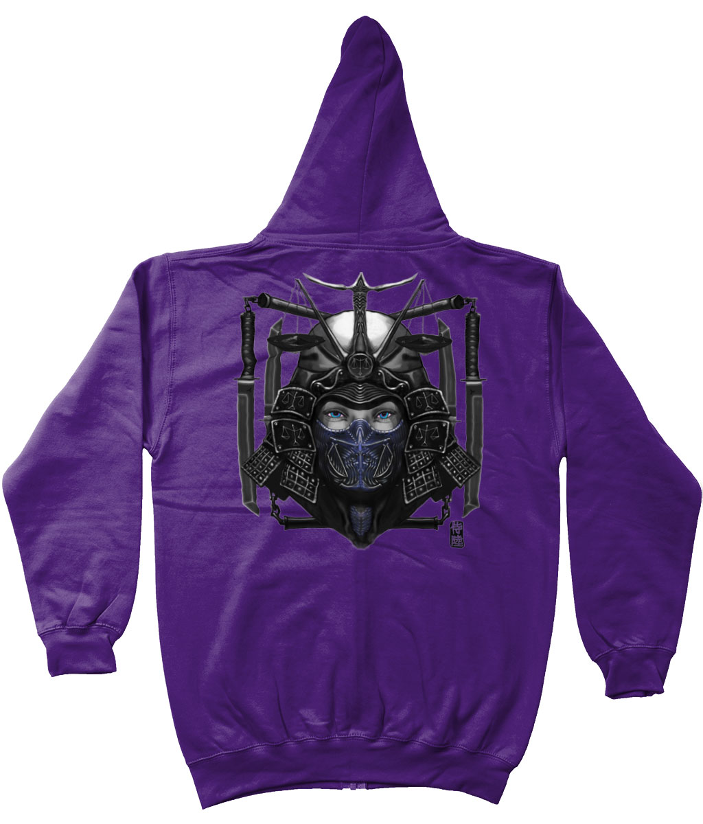 This hoodie with zipper is part of our zodiac Samurai clothing collection, featuring back printed design of Libra zodiac with Blue mask in Japanese Samurai art style. This zipper hoodie is made to order and available in multiple colors for your convenience.