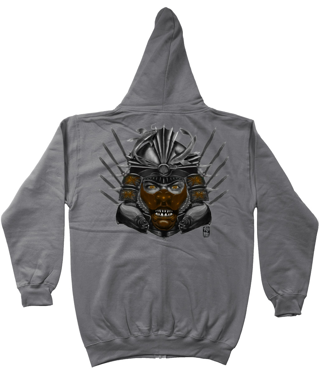 This hoodie with zipper is part of our zodiac Samurai clothing collection, featuring back printed design of Pisces zodiac with Brown mask in Japanese Samurai art style. This zipper hoodie is made to order and available in multiple colors for your convenience.
