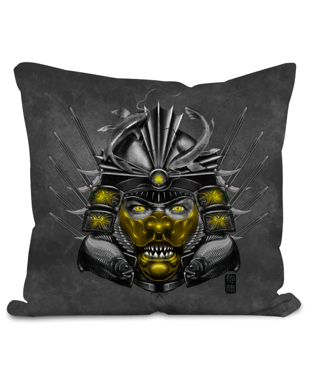 This throw cushion is part of our zodiac Samurai home décor collection. The design is printed on front and back of the pillow and available in 2 colors and 2 sizes. Featuring design of Pisces zodiac with Gold mask. This Samurai cushion is sure to make your space awesome.