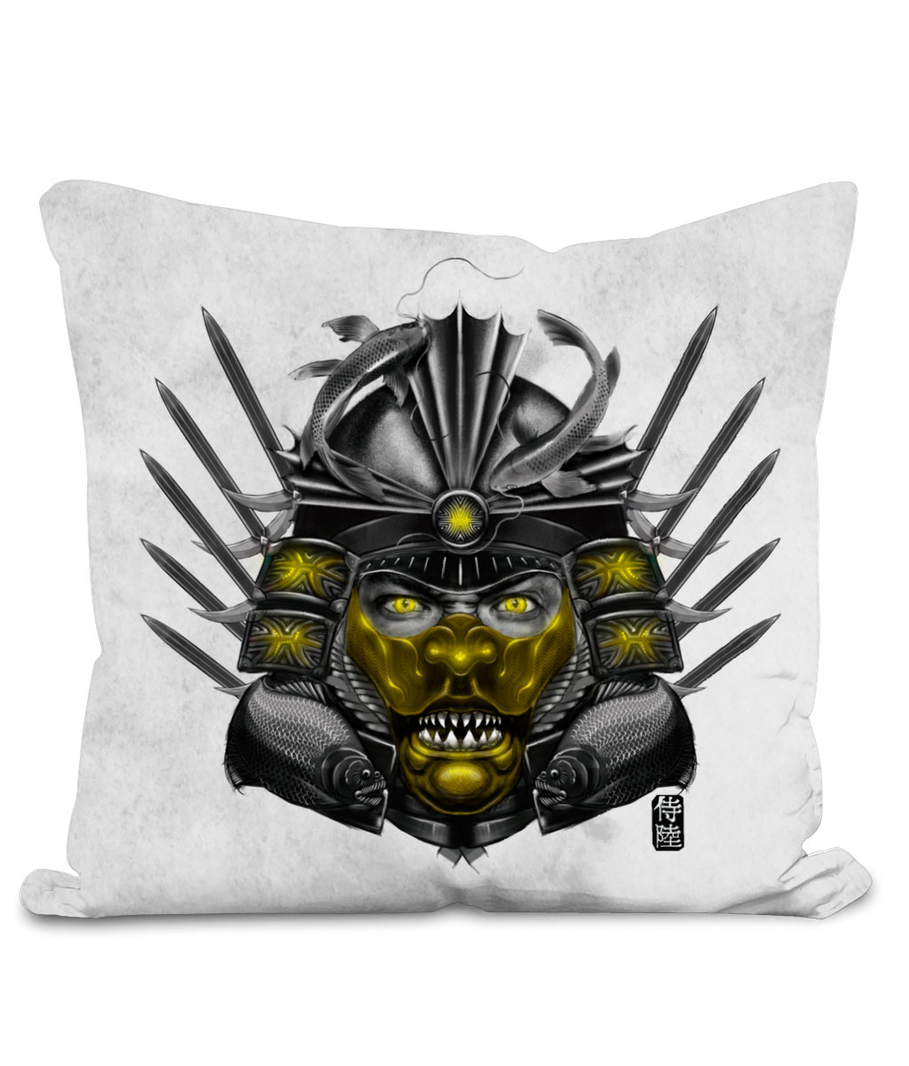 This throw cushion is part of our zodiac Samurai home décor collection. The design is printed on front and back of the pillow and available in 2 colors and 2 sizes. Featuring design of Pisces zodiac with Gold mask. This Samurai cushion is sure to make your space awesome.