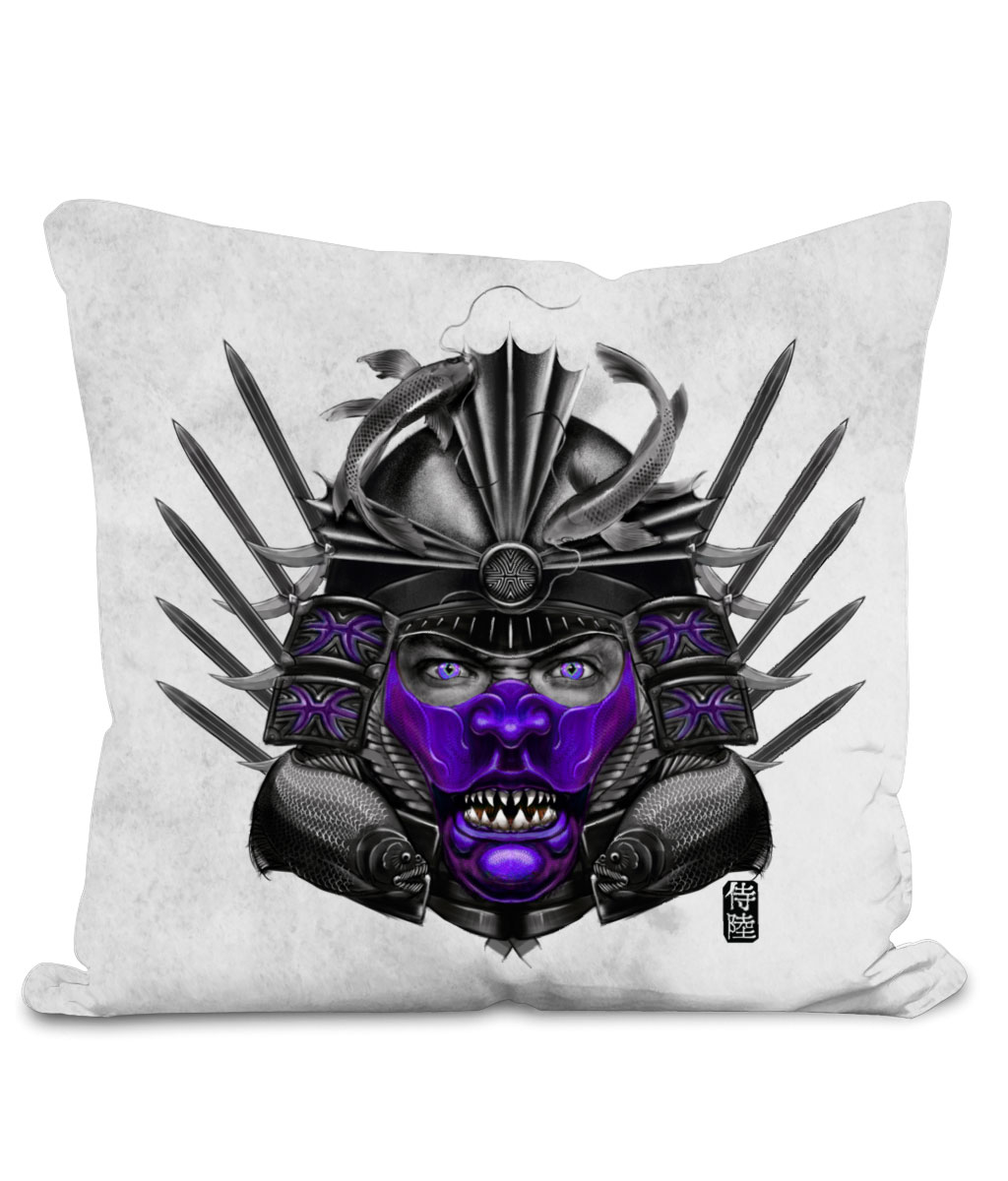 This throw cushion is part of our zodiac Samurai home décor collection. The design is printed on front and back of the pillow and available in 2 colors and 2 sizes. Featuring design of Pisces zodiac with Purple mask. This Samurai cushion is sure to make your space awesome.