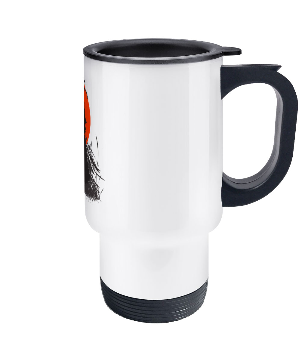 This travel mug is made of stainless steel with matte white finish and Rising Sun Samurai print, it is the ultimate solution for hot drinks.