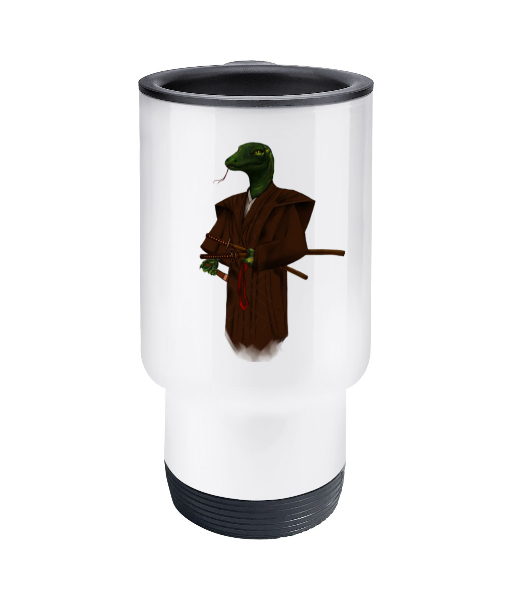 This 14 oz Snake Samurai stainless steel travel mug has a matte white finish and is a great choice for storing your drinks in.