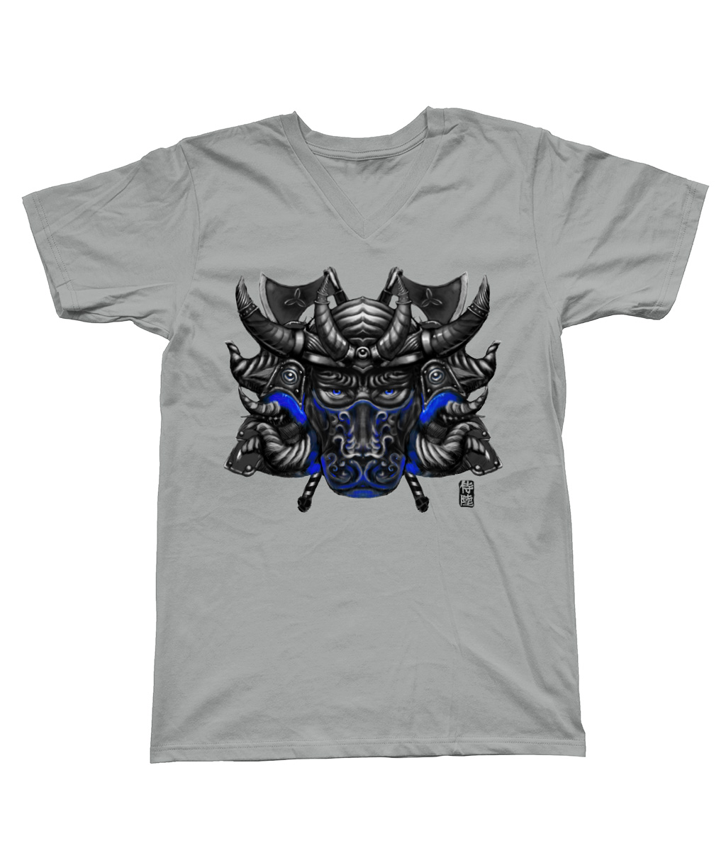This V Neck T-Shirt is part of our zodiac Samurai clothing collection, featuring V Neck T-Shirt design of Taurus zodiac with Blue mask in Japanese Samurai art style. The Samurai shirt is made to order and available in multiple colors for your convenience.