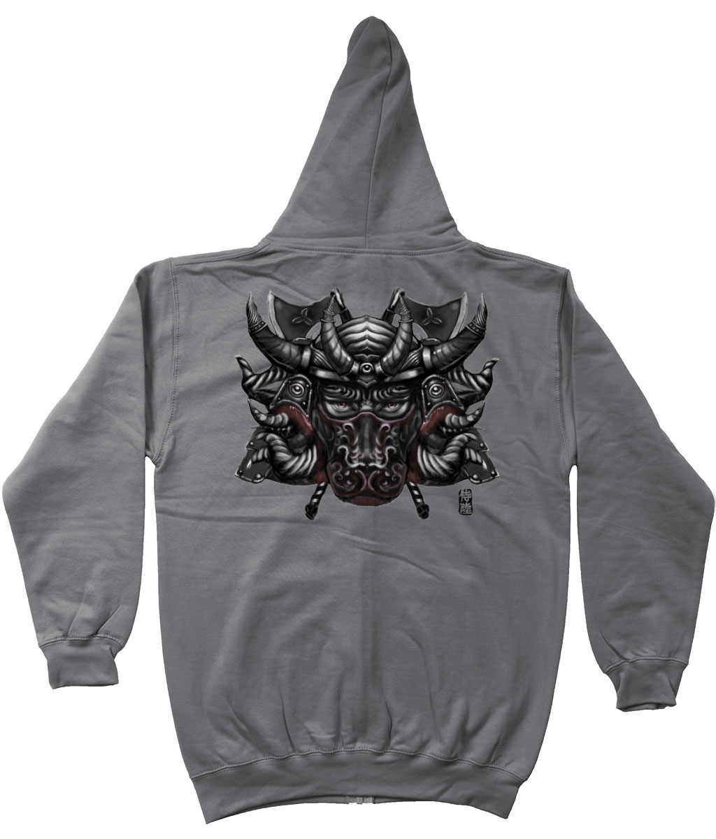 This hoodie with zipper is part of our zodiac Samurai clothing collection, featuring back printed design of Taurus zodiac with Brown mask in Japanese Samurai art style. This zipper hoodie is made to order and available in multiple colors for your convenience.
